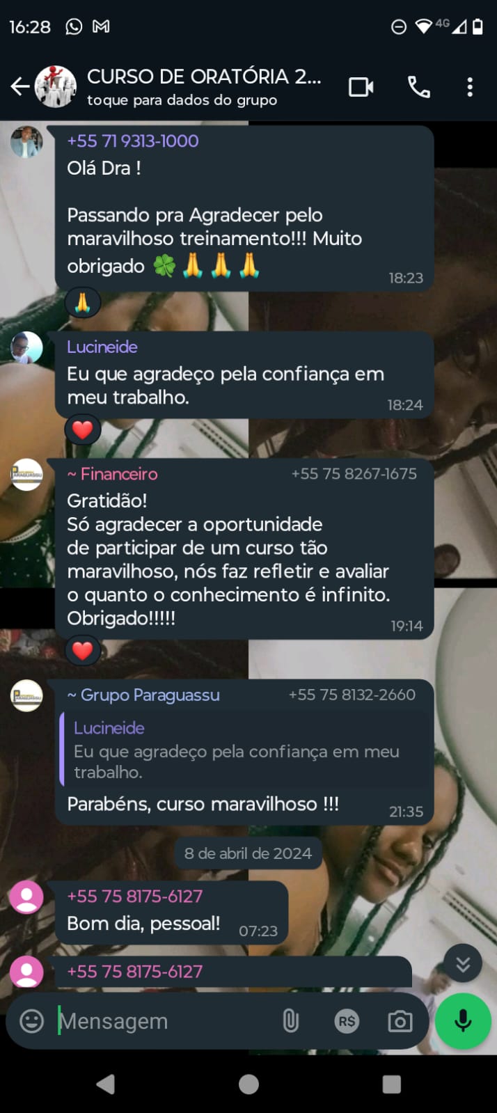 O CURSO ME AJUDOU MUITO, APLICA O QUE EU APRENDI NA VIDA PROFISSIONAL E PESSOAL. PASSEI A ME ATENTAR A EXPRESSĂO CORPORAL, ENTONAĂĂO DA VOZ, DETALHES QUE ANTES NĂO DAVA IMPORTĂNCIA MAS TENHO PERCEBIDO QUE FAZEM TODA A DIFERENĂA NA COMUNICAĂĂO.